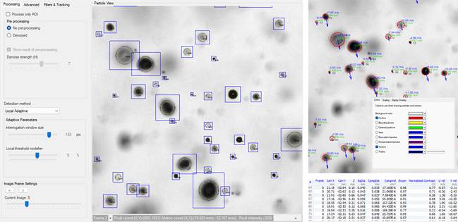DynamicStudio 中的自适应阴影追踪方法。农业空心锥喷雾中的颗粒检测。结果通过颗粒显示叠加图和数据表格呈现,便于快速可视化关键参数,如速度、尺寸、离心率等。