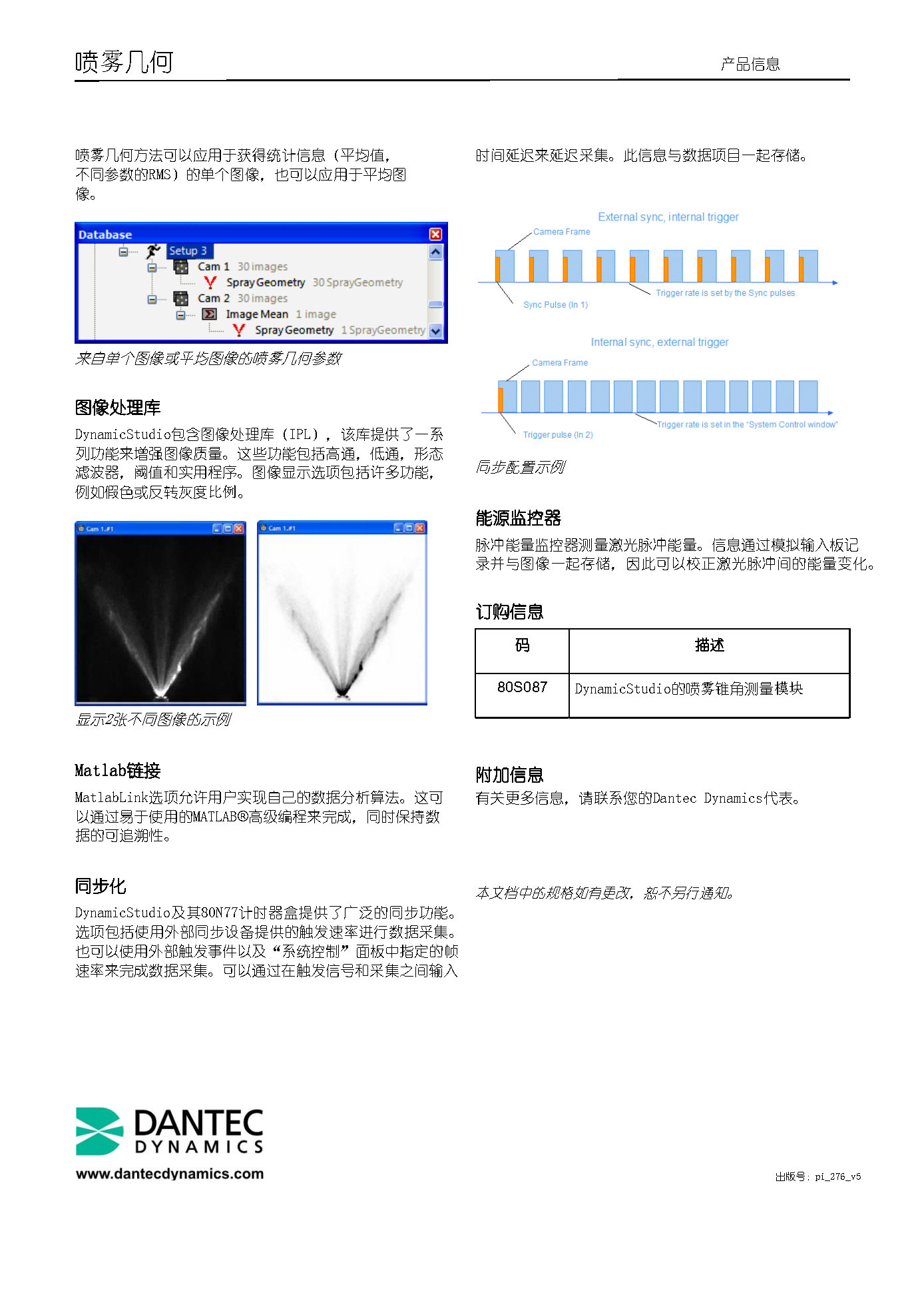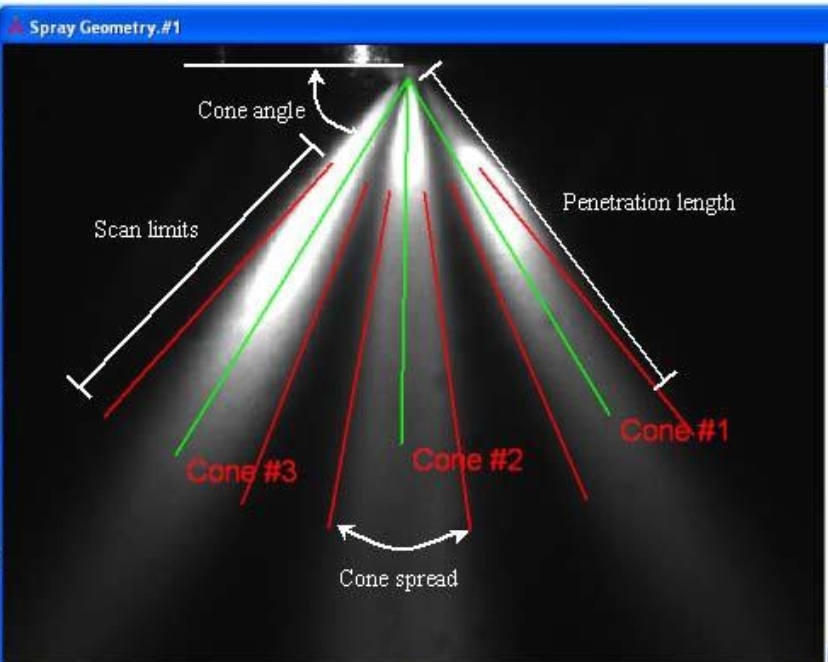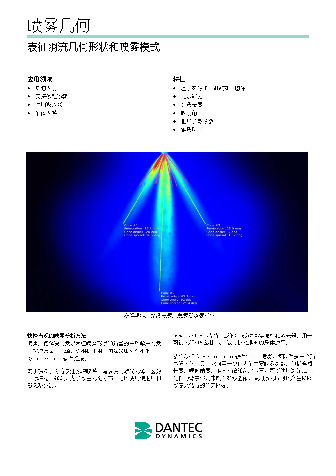 喷雾几何特征测量系统用来表征喷雾的形状和质量。它由照明系统、摄像机和用于图像采集和分析的DynamicStudio软件组成。有两种照明系统可供选择:可以使用阴影照相技术的背景照明光源照明,也可以使用米氏散射或激光诱导荧光(LIF)的片光照明。对于快速脉冲雾化,如喷油雾化,建议使用激光光源,因为它的光脉冲短而强。为了改善光的能量分布,可以使用ShadowStrobe